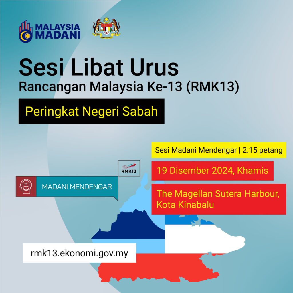 Jelajah Sesi Libat Urus dan Madani Mendengar untuk Rancangan Malaysia ke-13 (RMK13) akan diteruskan di negeri Sabah pada 19 Disember 2024, Khamis.