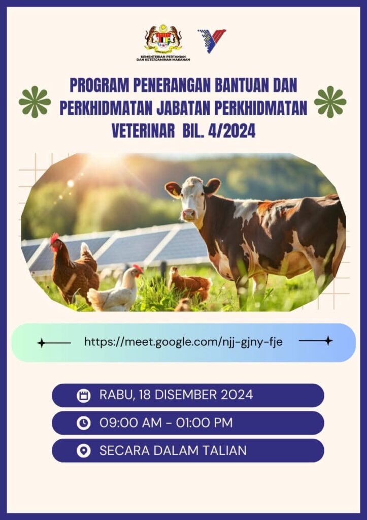 om sertai Program Penerangan Bantuan dan Perkhidmatan Jabatan Perkhidmatan Veterinar Bil. 4/2024 melalui google meet atau fb live DVS seperti link di bawah.